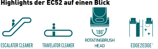 EC52 Spannung: Arbeitsbreite: Bürstendrehzahl: Bürstendurchmesser: Bürstenmotor: Saugmotor: Pumpe Frischwasser: Frischwassertank: Schmutzwassertank: Gewicht (leer): Länge: Breite: Höhe: Anschlusskabel: