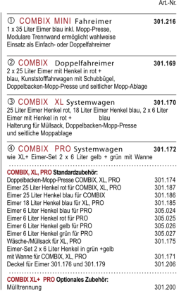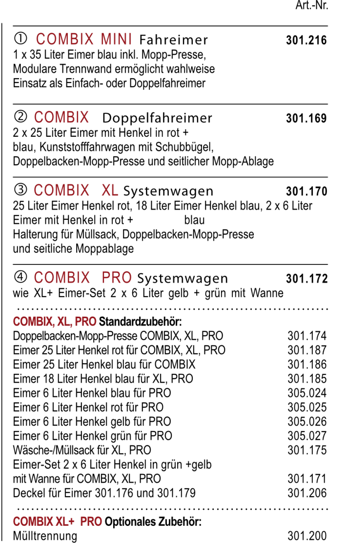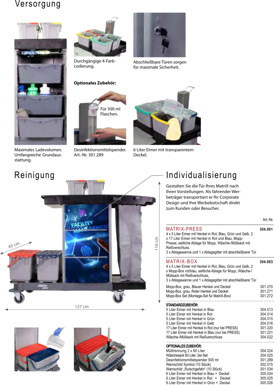 Verschließbarer Reinigungswagen in zwei Ausführungen.Der Matrix, wahlweise mit Mopp-Presse oder Mopp-Boxen, besticht durch perfekte Verarbeitung, eine äußerst solide und robuste Bauweise, sowie ein hervorragendes Preis-Leistungs-Verhältnis.Der extra große Innenraum verfügt über drei ausziehbare Wannen und ein Ablagegitter und bietet vielseitigen Stauraum für die Aufbewahrung von Reinigungsmittel oder andere Utensilien. Die abschließbare Türe gewährleistet maximale Sicherheit im Objekt und garantiert jederzeit ein modernes und dezentes Erscheinungsbild. Dank der großen gummierten 100 mm Lenkrollen, lässt sich der Matrix auch bei voller Ladung jederzeit mühelos und sicher bewegen. Die	hinteren Lenkrollen verfügen über zwei einzeln arretierbare Feststellbremsen und sichern den Matrix beim Abstellen vor ungewolltem Wegrollen.