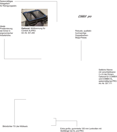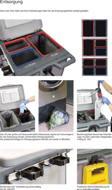 Für die Flur-, Zimmer- und Badreinigung in öffentlichen Einrichtungen, Büros, Hotels, Pensionen. Farblich getrennte Wischeimer und Halterung für Wäsche-/ Müllsack.Der Reinigungswagen in Profiqualität besteht aus zwei robusten Kunststoff Bodenplatten, wobei die hintere Ablage je nach Bedarf abgenommen werden kann. Die stabilen Metall-Lenkrollen und die großen, gummierten Hinterräder erfüllen die Anforderungen für den täglichen, Einsatz. Der Deckel über dem Wäsche-/ Müllsack kann bequem vom ergonomisch geformten Schubbügel aus bedient werden. Ein Mopp oder Besen kann sicher im integrierten Halter fixiert werden. Für das Warnschild ist eine gesonderte Halterung am Rahmen integriert. Serienmäßig wird der PuriX mit vier Eimern, einer seitlichen Moppablage, geräumigem 120 Liter Wäsche-/Müllsack und einer Doppelbacken-Mopp-Presse ausgeliefert. Am Wagen kann eine Medusa Akkukehrmaschine mitgeführt werden.
