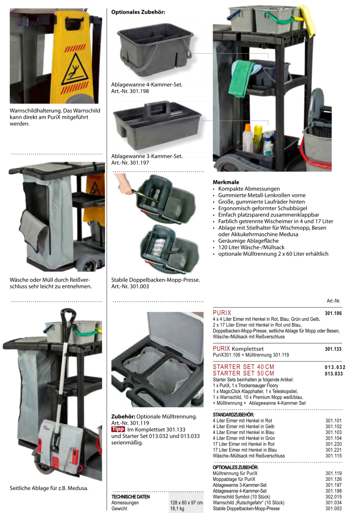 Für die Flur-, Zimmer- und Badreinigung in öffentlichen Einrichtungen, Büros, Hotels, Pensionen. Farblich getrennte Wischeimer und Halterung für Wäsche-/ Müllsack.Der Reinigungswagen in Profiqualität besteht aus zwei robusten Kunststoff Bodenplatten, wobei die hintere Ablage je nach Bedarf abgenommen werden kann. Die stabilen Metall-Lenkrollen und die großen, gummierten Hinterräder erfüllen die Anforderungen für den täglichen, Einsatz. Der Deckel über dem Wäsche-/ Müllsack kann bequem vom ergonomisch geformten Schubbügel aus bedient werden. Ein Mopp oder Besen kann sicher im integrierten Halter fixiert werden. Für das Warnschild ist eine gesonderte Halterung am Rahmen integriert. Serienmäßig wird der PuriX mit vier Eimern, einer seitlichen Moppablage, geräumigem 120 Liter Wäsche-/Müllsack und einer Doppelbacken-Mopp-Presse ausgeliefert. Am Wagen kann eine Medusa Akkukehrmaschine mitgeführt werden.
