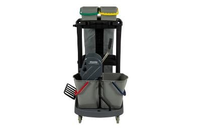Für die Flur-, Zimmer- und Badreinigung in öffentlichen Einrichtungen, Hotels, Pensionen, Krankenhäusern und der Altenpflege. Farblich getrennte Wischeimer und Halterung für Wäsche-/ Müllsack.